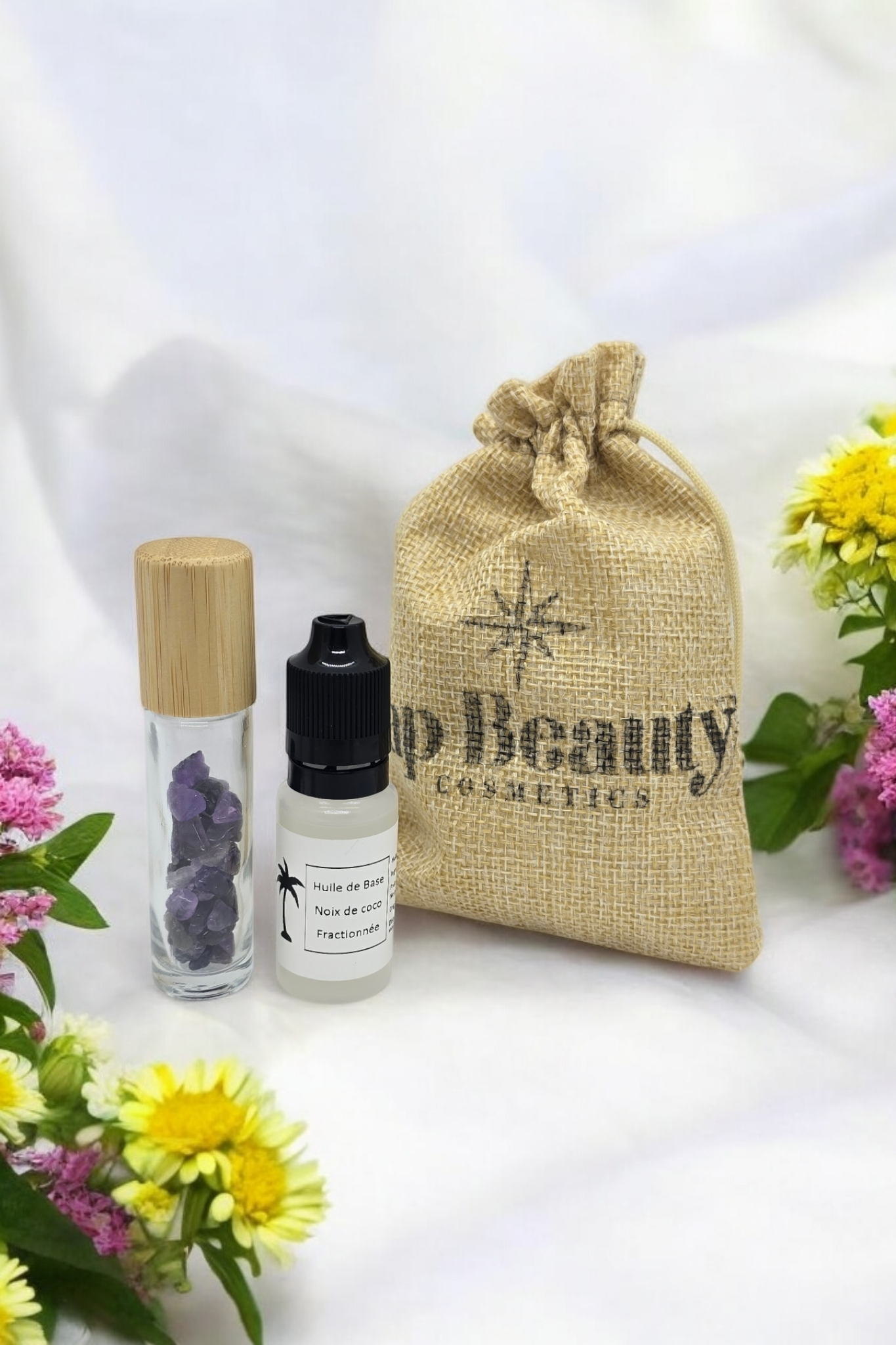 - Un roll-on en verre de 10 ml avec embout en pierre d’améthyste et bouchon en bois, prêt à être rempli.